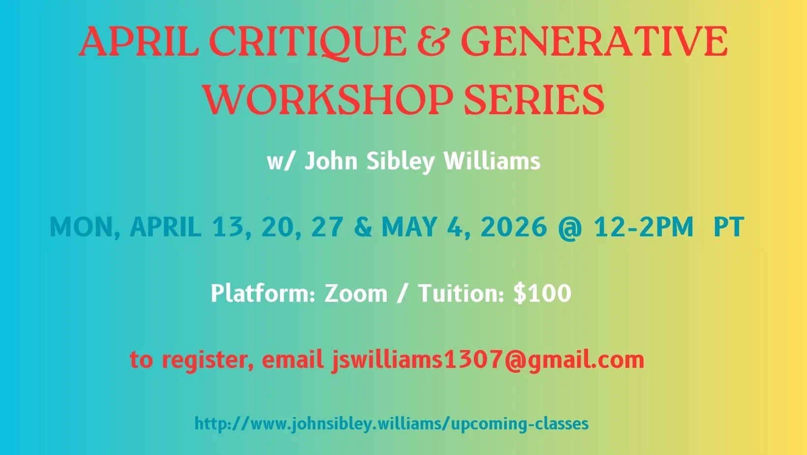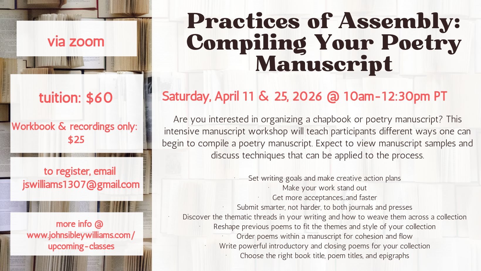 Join award-winning poet, teacher, editor, and literary agent John Sibley Williams for this intensive two-session workshop that will take you all the way from inspiration to publication! This workshop is for poets ready to organize their work into a collection, as well as working toward journal and book publication.