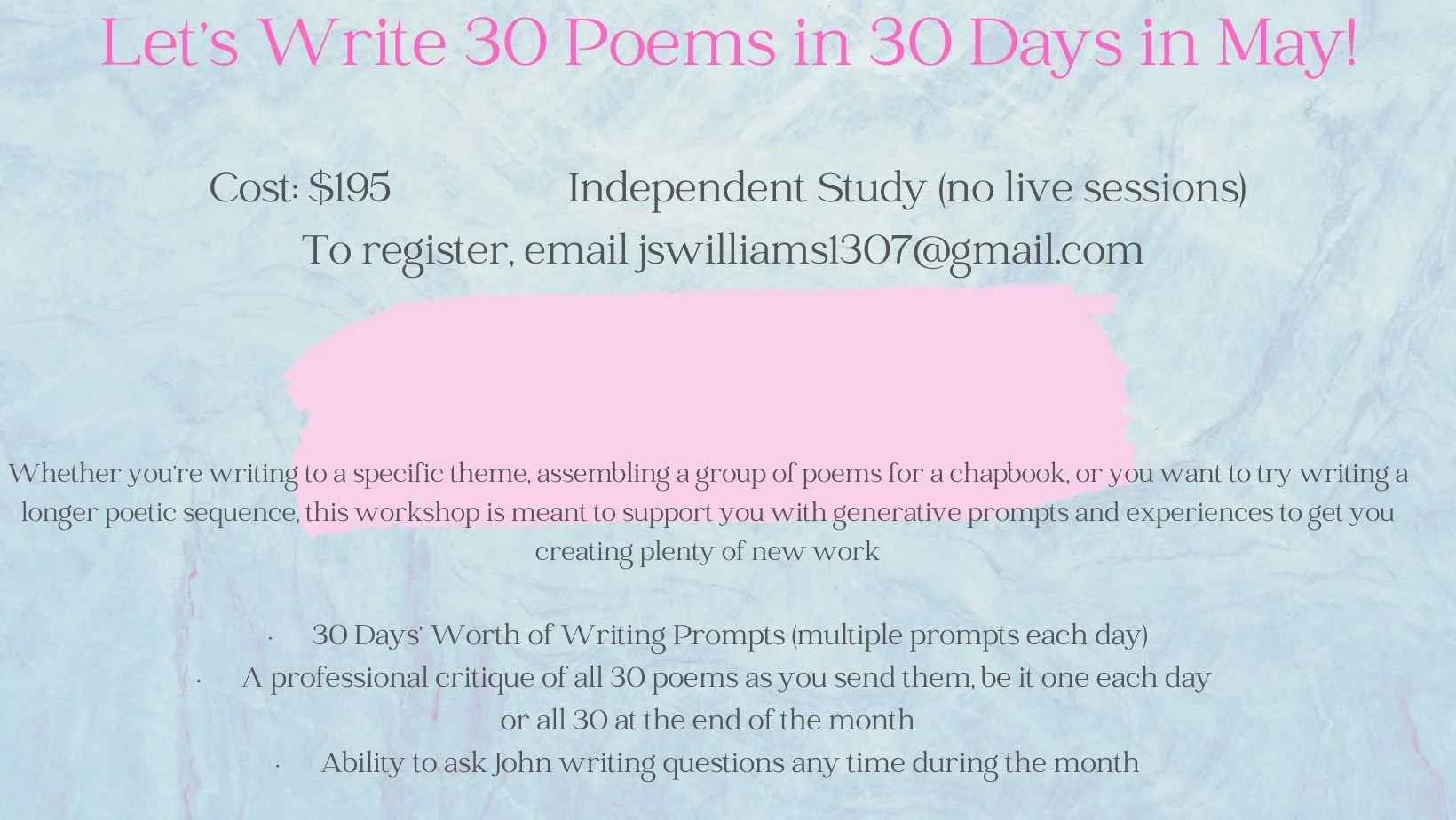 Similar to the goals of NaPoWriMo (National Poetry Writing Month), the aims of this self-paced class is to write 30 poems in 30 days. However, you might write one poem a day, or several poems in a day, and then give yourself a break. It’s totally up to you!