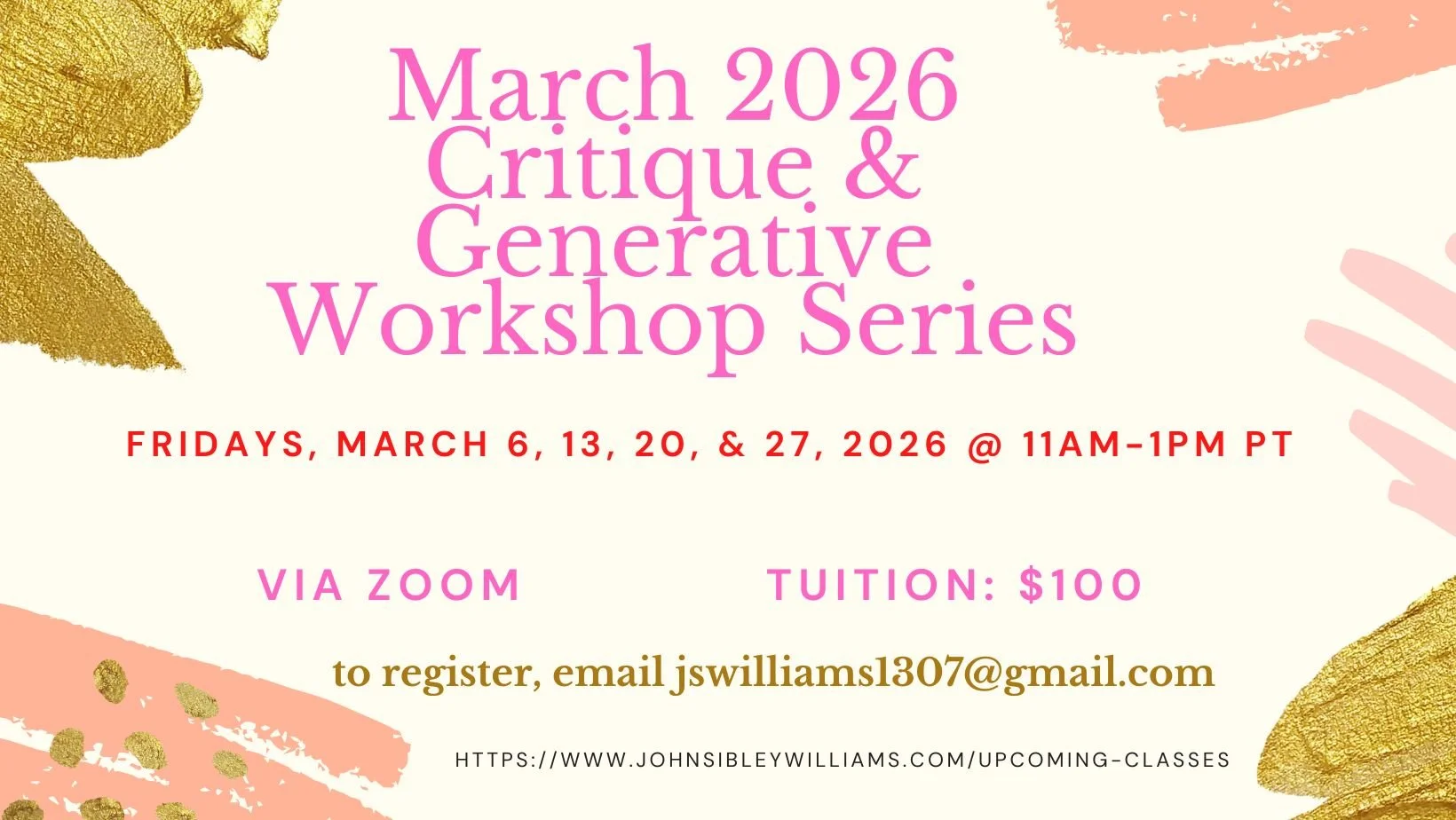 To keep you consistently inspired, writing, and honing your craft, and to keep you engaged in a passionate poetic community, this month-long workshop series is aimed at helping you see your poems in a new light, broadening your vision, and improving your mechanics. Topics likely to arise include syntax, lineation, sound and rhythm, tone and mood, use of imagery, balancing the personal and universal, and other rhetorical strategies.