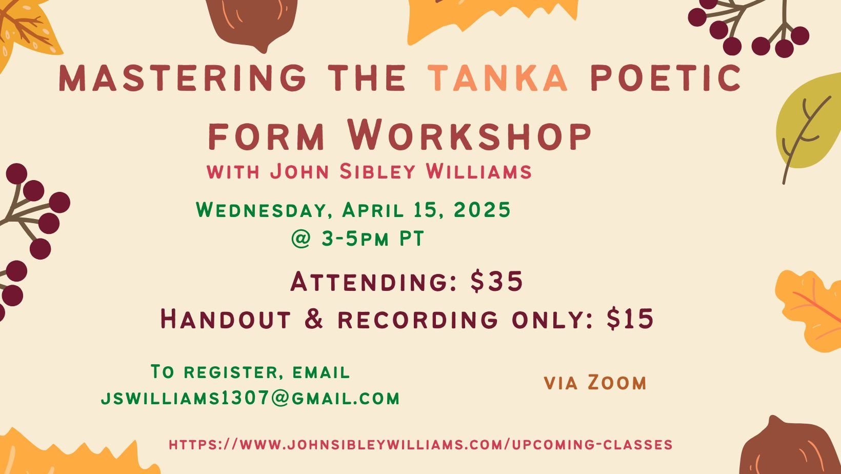 This intimate workshop will include lessons, analysis of well-known ancient and contemporary tanka, in-class activities and writing, and (optional) sharing drafts with the class.