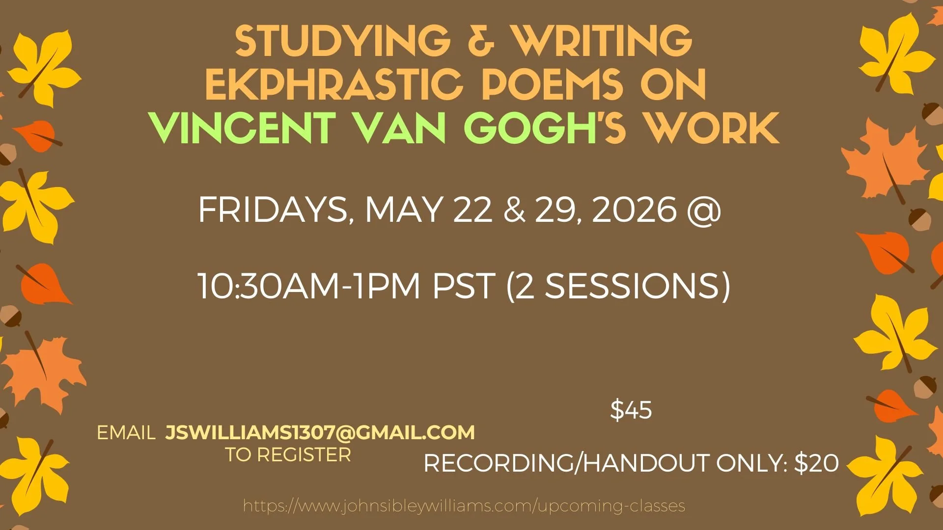 In this workshop, we will analyze a variety of poems with unique approaches to exploring van Gogh’s work, including the abstract, surreal, natural, and the deeply human. There will also be a variety of writing activities throughout and an opportunity to share your work with our small, safe group of wonderful poets! And the workshop includes a robust 50-page workbook.